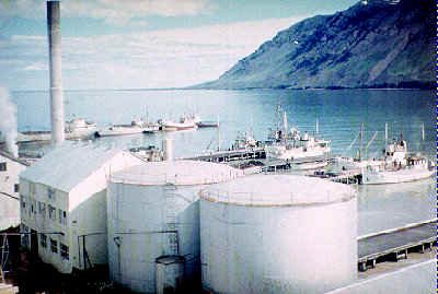 Söltunarstöð SR. SRP í bak og Íshús SR til vinstribak við tunnustafla. Ljósmynd